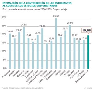For communities where students copay is higher (see table below) is in Extremadura (a 29.92%), followed by Murcia (26%) and the Balearic Islands (24.65%). At the bottom is Catalonia (15.19%) and Cantabria (16.17%). But the observatory was born in Catalonia, admits that these percentages have changed and gives the example of Catalonia, which has been applied in recent years, the maximum allowable increase in prices. That would increase to 21.38% today which border the Catalan students.