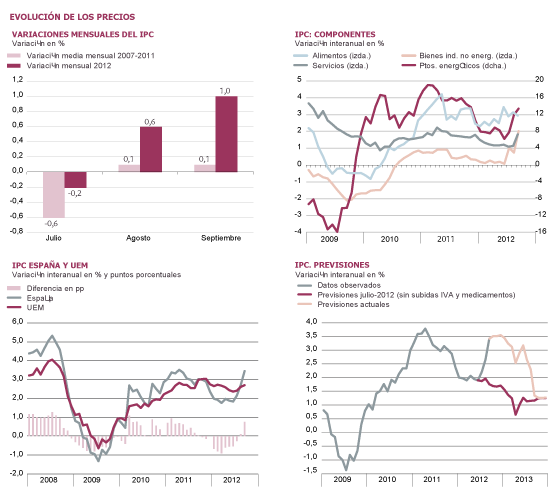 Inflation is again a problem. In June we were at 1.9% and three months later at 3.4%. The trouble is not due to demand pressures, on the contrary, is sinking, nor to increases in labor costs. This type of inflation would have at least some positive effect, as some relief for debtors, plus it would mean that the economy regained its strength. But no, inflation is bad by any measure. Their origin is twofold: the oil barons insatiably sablean us and the public sector has decided to keep a larger share of the pie at the expense of families and businesses (VAT hike and the increase in the price of medicines paid by the consumer). These two factors are divided almost equally responsible for the rise. As a consolation, the forecasts suggest that inflation should not go much further and we will end the year at 3.5%, if he does not rise again for oil.