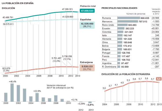 This is the first decline since 1996, the first year for which official data are available. Since then the population recorded in Spain had increased every year mainly due to the registration of aliens. But the departure of immigrants by the economic crisis has caused a decline that has been increasing in recent years. Thus, in 2011, and there were 15,229 registered foreigners less. And in 2012 also fell by 216 125 people to reach 5.5 million. Of these 2.4 million citizens of the European Union. The INE noted that 85.9% of the registered population was born in Spain and 14.1% abroad.