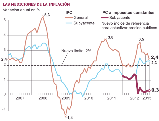 The government of Mariano Rajoy has informed the Commission that the alternative chosen is "the core CPI at constant tax rates, with an upper limit of 2%". The commitment is to apply the new rule since January 1, 2014. If he had applied in March, the difference between checking prices either reference would have been remarkable: the CPI reflected an annual increase of 2.4%, its future replacement, the underlying tax rate constant, barely reached 0 , 3%.