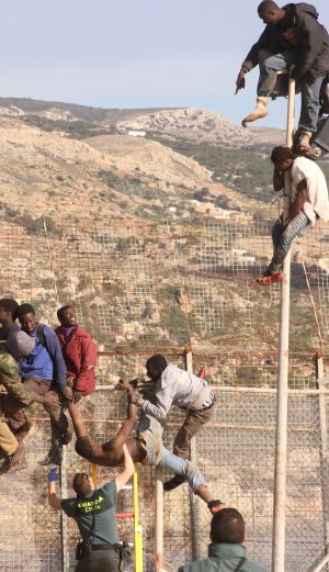 Certains immigrants perchés sur la clôture de Melilla. / Antonio Ruiz