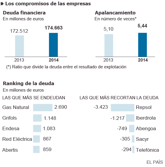 SaveThe corporate debt has been during the long crisis Thermometer investor fear. The recession took to the highly indebted Spanish companies and the result was an accelerated race to shed weight. The high financial costs, with closed markets and very few ratings punished by the rating agencies forced the managers to reduce debt, primarily through divestitures. This culture of austerity, however, seems to have found a turning point in the year 2014. The Ibex 35-except to the benches aculaban net debt 174 663 000 on 31 December. This is an increase of only 1.24% over the previous year, but it is very significant if one considers that it is the first time in four years that the debt grows.The increase in debt and still ailing companies' ability to generate cash flow resulted in a rise in leverage (ratio comparing operating income to debt). If in 2013 the Ibex had to spend 5.1 times operating income that year to leave the counter to zero debt, in 2014 the ratio rose to 5.44 times. Financial expenses of companies (interest payments) also increased slightly over the past year.Natural gas was the company that raised its debt over the past year. The financial commitments of the energy company increased by 2,690 million mainly due to the acquisition of the Chilean company General Electric Company. Second, it highlights the increasing debt of Grifols (1,148 million) resulting from the purchase of the unit of Novartis transfusion diagnostics. The third company's debt was raised Endesa. In the case of electricity, leverage is due in large part to the payment of an extraordinary dividend.On the opposite side, the company Ibex most reduced its debt in 2014 was Repsol. Oil downgraded this item in more than 3,400 million. However, this figure does not account for the recent purchase of the Canadian company Talisman, so the leverage of Repsol will grow in the coming quarters. Iberdrola, Abengoa and Sacyr following companies were the most lowered their financial commitments during the past year.In the Ibex 35 there are only five companies (Inditex, Tecnicas Reunidas, Mediaset, Gamesa and BME) in net financial position (as opposed to debt). For Inditex its cash position at the end of its fiscal third quarter amounted to 3 626 million euros. The second largest net cash position is to Tecnicas Reunidas, with 664 million, followed by Mediaset 265 million. It highlights the case of Gamesa, which has grown from 420 million in debt at year-end 2013 to have a box of 143 million. As market sentiment has changed, investors begin to sue those companies with a comfortable financial position to do something with your box: either to grow through acquisitions; or to break the bank and pay an extraordinary dividend.
