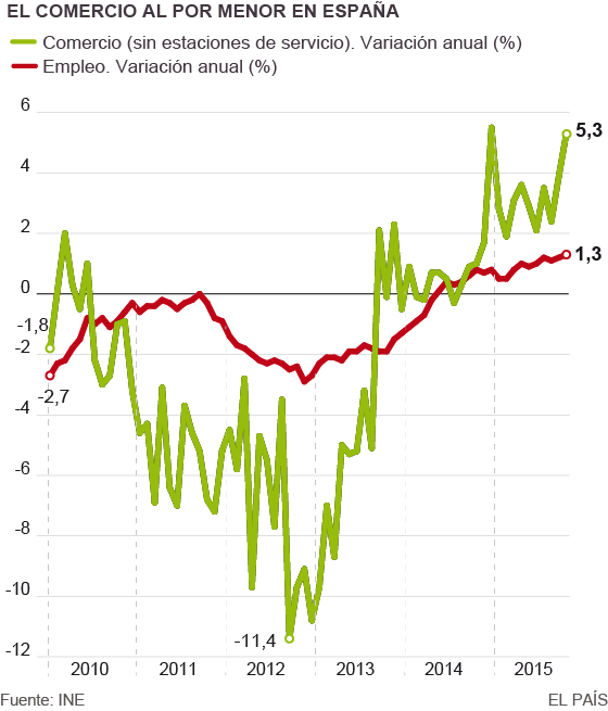 L'attraction de la consommation intérieure est perceptible dans le commerce de détail. En Octobre, il renoue avec la croissance, a fait 5,3% par rapport au même mois l'an dernier, et 15 des chaînes consécutives de hausse. L'augmentation serait plus grande si les achats dans les stations de gaz et stations-service ont été inclus dans ces données. Il passerait à 5,8%, l'Institut national de statistique (INE). Jusqu'à présent cette année, ces chiffres montrent que le commerce connaît sa meilleure année de la crise. Cependant, il ya encore loin des niveaux atteints en 2005, 2006 et 2007.